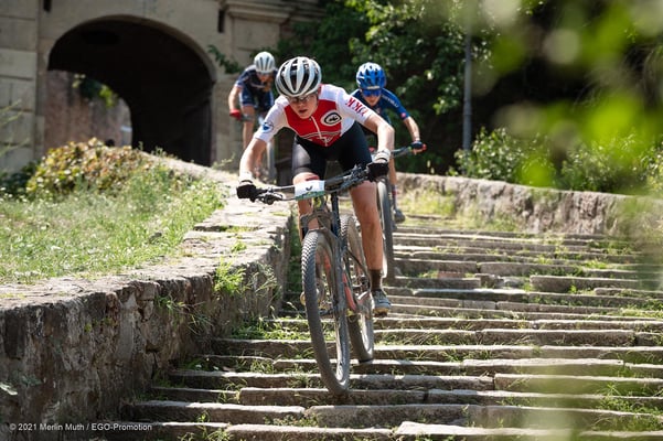 Impressionen vom EM-Rennen der Juniorinnen von gestern. Lea konnte, nach einem eher verhaltenen Start, zur Spitzengruppe aufschliessen und zusammen mit vier anderen Fahrerinnen das riesige Feld anführen. Die Strecke war staubtrocken und gespickt mit viele Treppenpassagen. Mit den hohen Temperaturen war es wichtig, die Kräfte richtig einzuteilen und sich gegebenenfalls mit Wasser abzukühlen. Lea konnte super mit diesen Bedingungen umgehen und in der zweitletzten von fünf Runden war sie mit einer Französin und einer Italienerin allein an der Spitze.